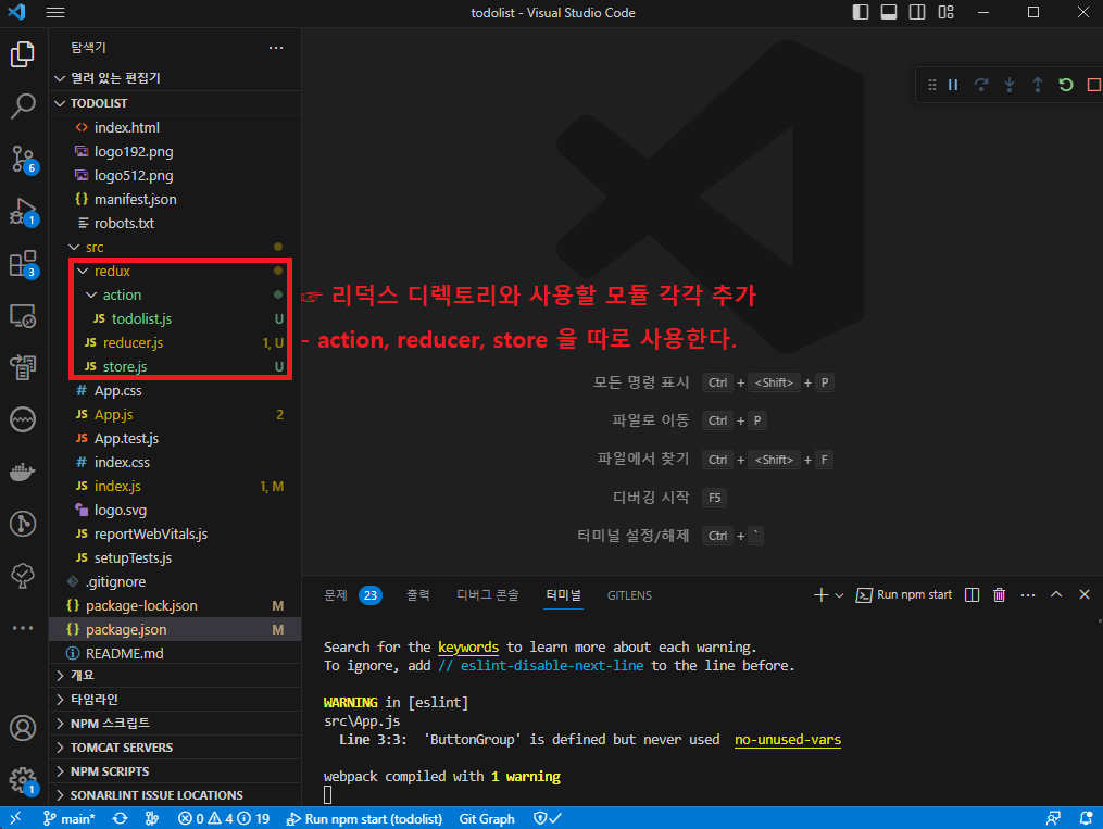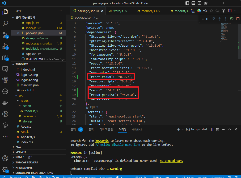 redux 관련 설치 후 package.json 에서 네모 박스에 설치가 되어있는지 확인