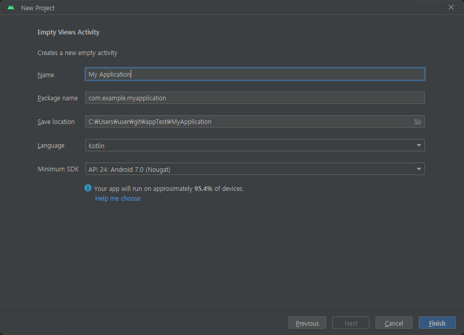 - Minimun SDK : 최소버전 설정 현재 지금 상황으로는 API24 버전으로 주로 쓰이고 있습니다.