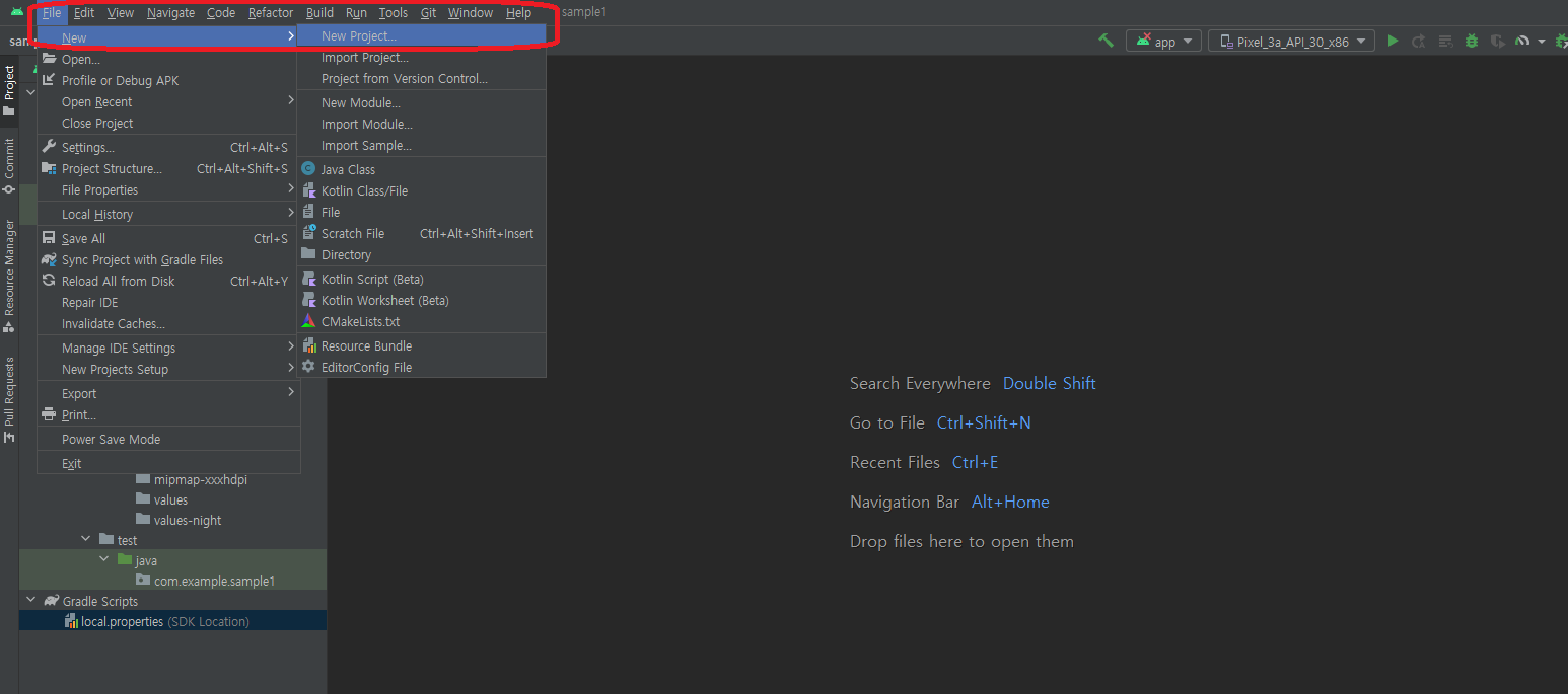 프로젝트 생성 방법 : File -> New -> New Project 를 엽니다.
