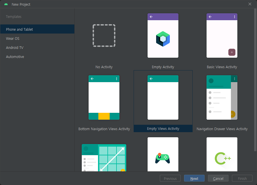 열고난 이후, Empty Views Activity를 클릭후 Next 버튼 클릭