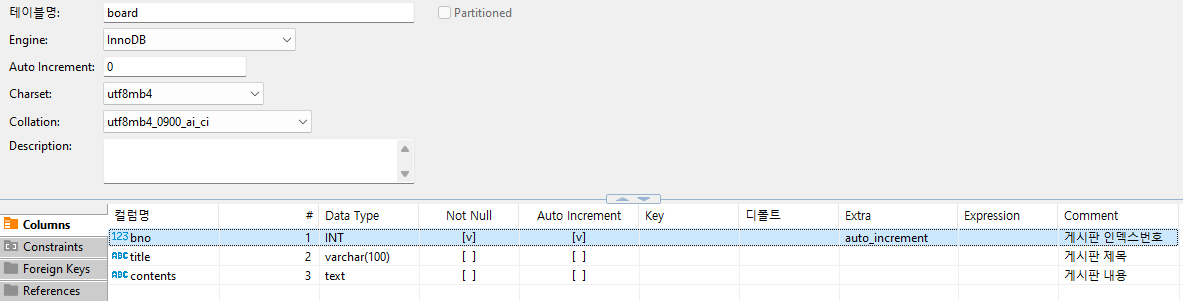 8) 이때, 아래와 같이 테이블명은 board로 지정하고, Column을 bno (게시판 인덱스 번호), title(게시판 제목), contents(게시판 내용)을 입력하여 아래와 같이 설정해줍니다.