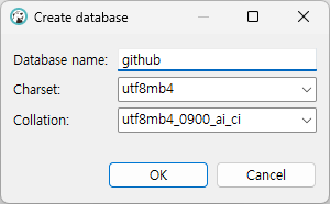 5) 다음은 github 데이터 베이스을 생성해봅니다. 오른쪽 마우스 클릭 후 "create new database:" 클릭하여 database name을 "github" 라는 데이터 베이스를 입력하고 "OK" 버튼 클릭