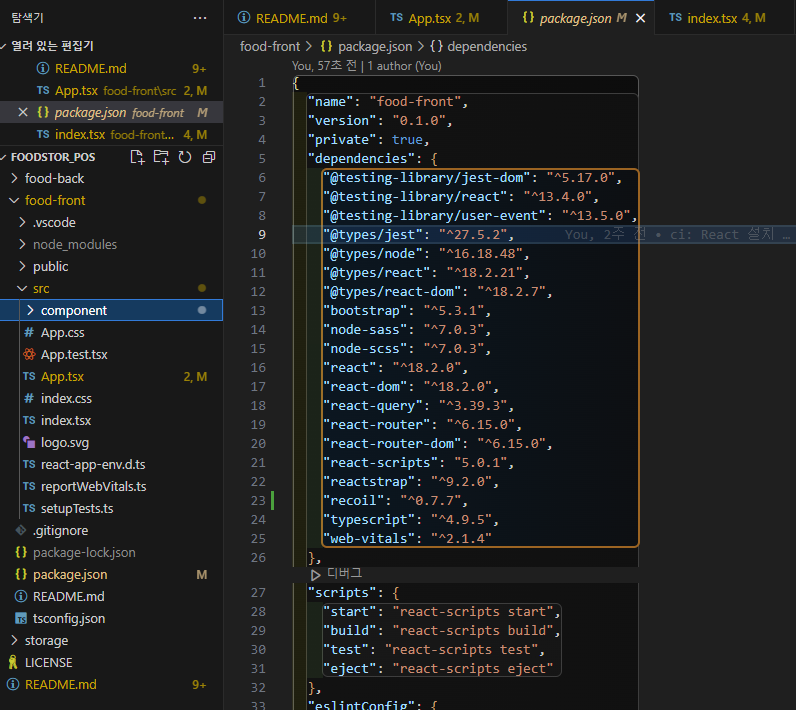 아래와 같이 typescript로 설치가 완료 되고, 마찬가지로 package.json에서 설치됨을 확인할 수 있습니다.