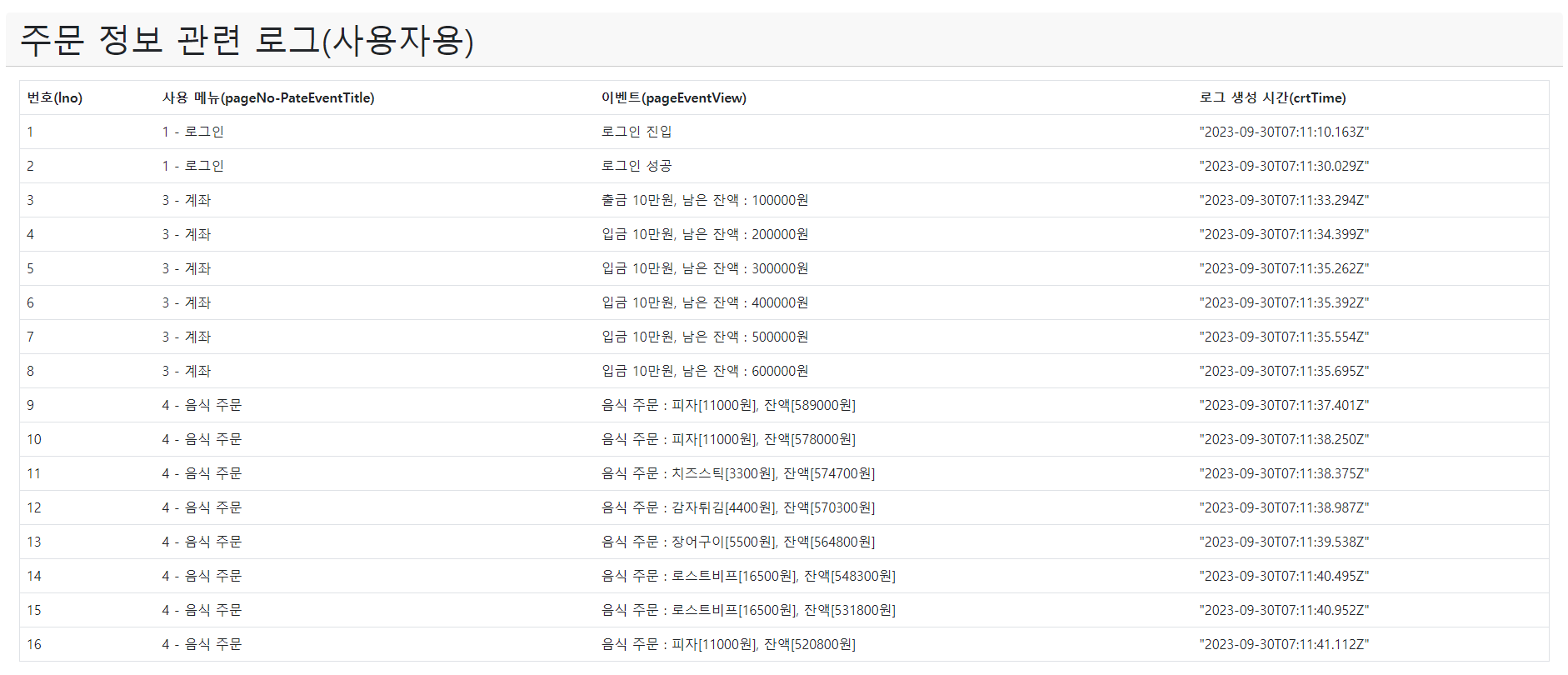 고객이 이용한 서비스 로그로 이용하여 로그인, 입출금, 음식 주문과 같은 내역을 출력하도록 완성하였다.