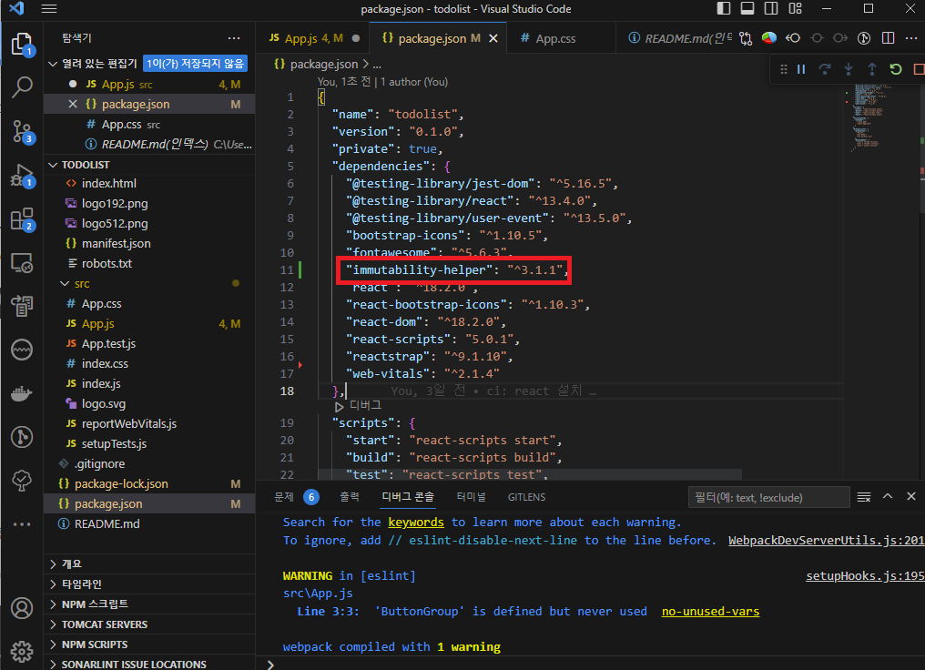 먼저, 사전 작업으로 npm 패키지에서 immutability-helper 설치하겠습니다.